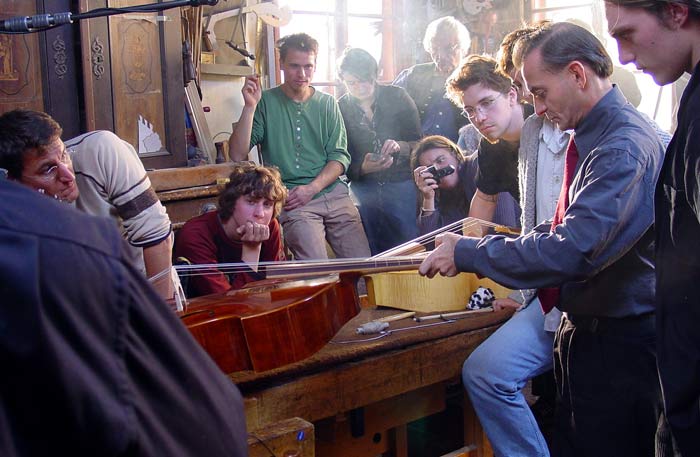 Setting up a new copy of the Michael Albanus viola da gamba built in the school.